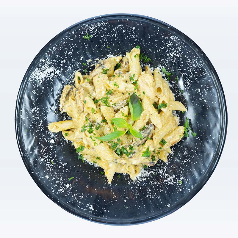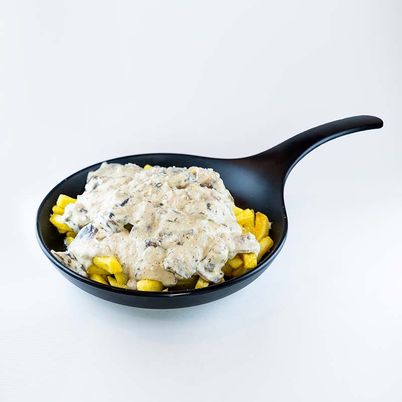 فیله مرغ ، قارچ ، سس الفردو ، نان ، سیب زمینی سرخ شده