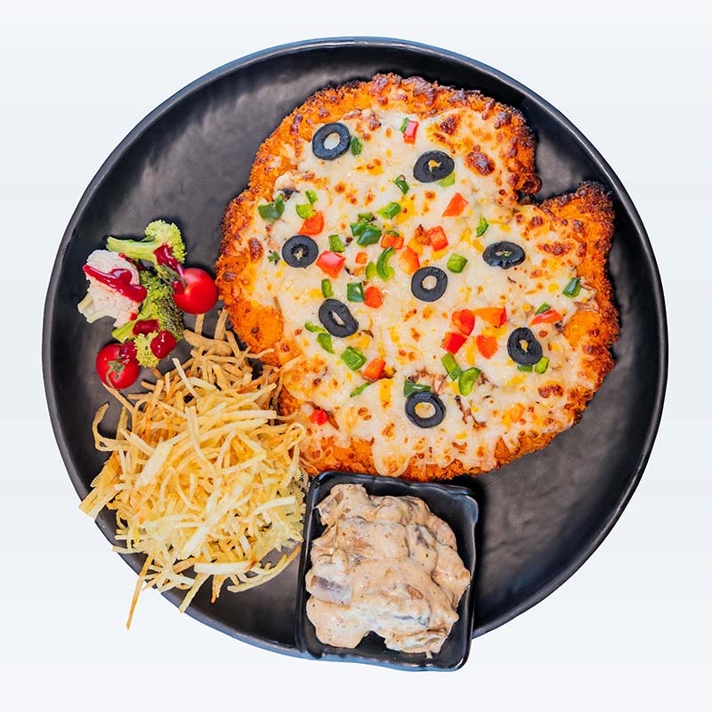 شنیسل سوخاری ، متریال پیتزا ، دورچین ، سیب زمینی سرخ شده ، سس قارچ ، سبزیجات سرخ شده