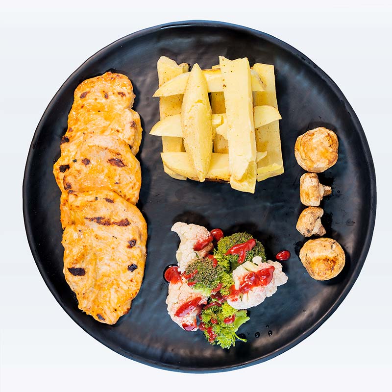 مرغ گریل ، کلم سفید ، کلم بروکلی ، سیب زمینی گریل شده ، قارچ گریل شده ، ذرت ، هویج ، زیتون ، سبزیجات