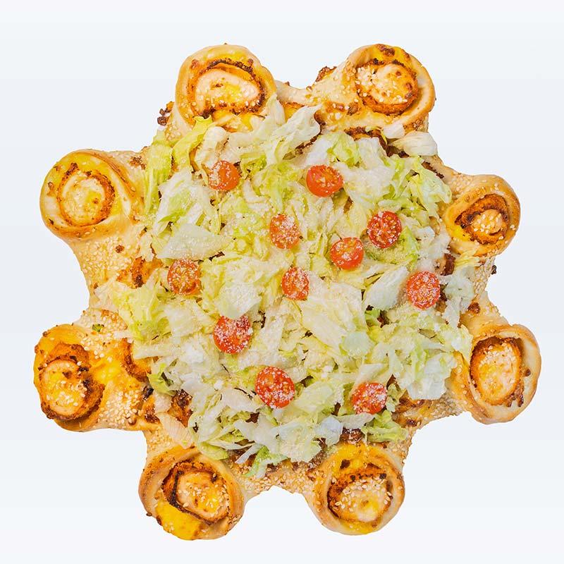 پنیر چدار ، پنیر پیتزا ، سس مخصوص ، مرغ سوخاری رول شده مخصوص ، سس سزار ، اسلایس زیتون سیاه ، کنجد ، کاهو ، گوجه نگینی ، پنیر پارمیسان