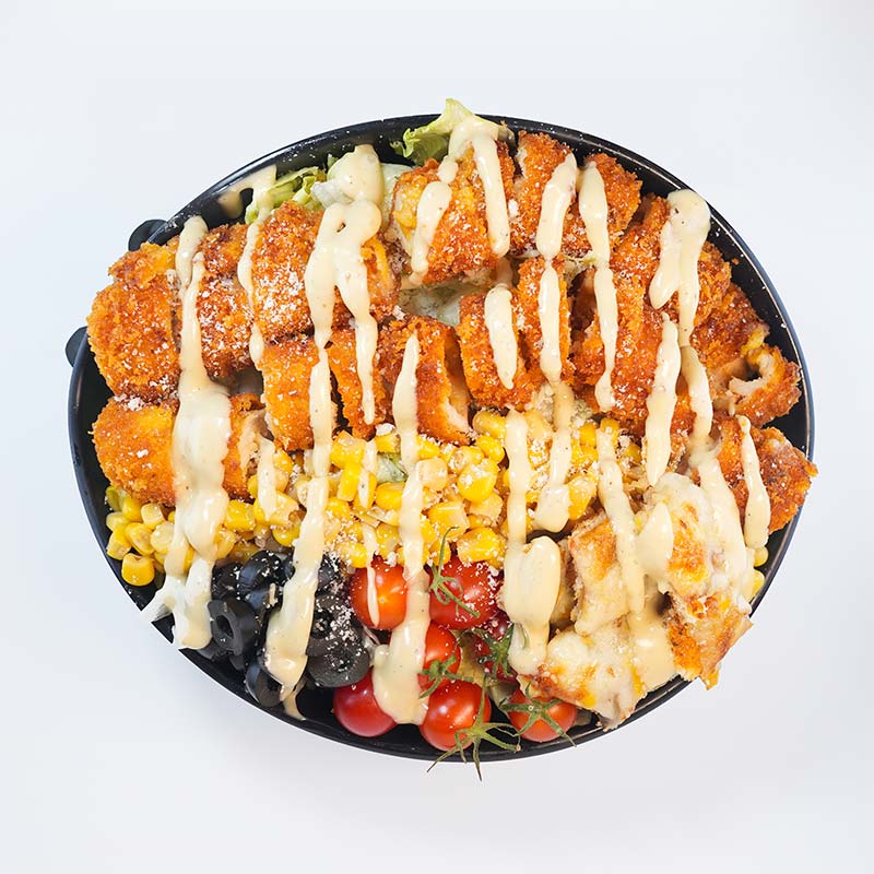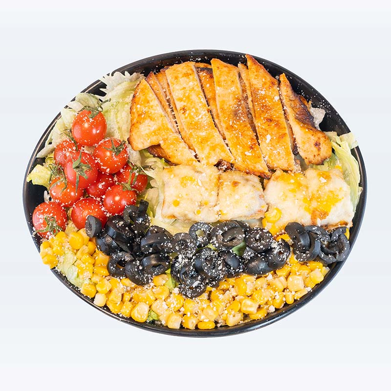 مرغ گریل ، کاهو ، گوجه ، ذرت ، زیتون ، دلمه ، نان سیر ، پنیر پارمیسان