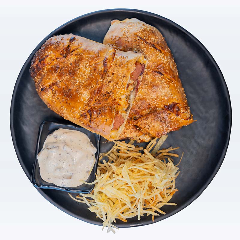 2 عدد هات داگ ، سس قارچ ، پنیر پیتزا ، خمیر مخصوص ، کنجد ، سیب زمینی خلال سرخ شده