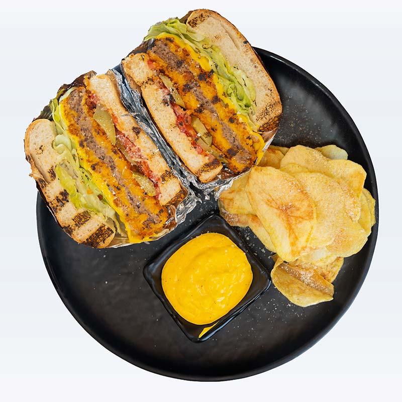 برگر 120 گرم ، گوجه ، خیارشور ،کاهو ،سس مخصوص ، پنیر گودا ، نان ، سیب زمینی سرخ شده