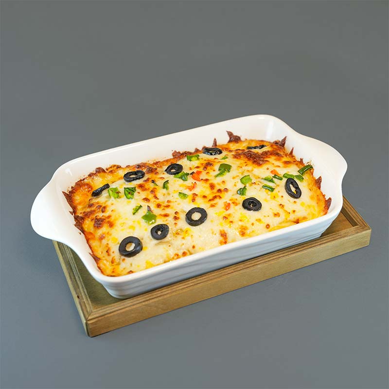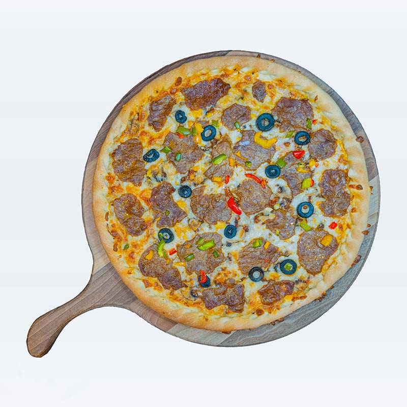 راسته گوساله مرینت شده ، قارچ ، پنیر پیتزا ،سس مخصوص ، اسلایس زیتون سیاه ، فلفل دلمه